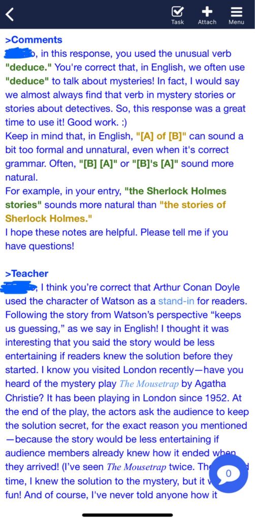 レベッカ先生の添削やお返事がとても丁寧!